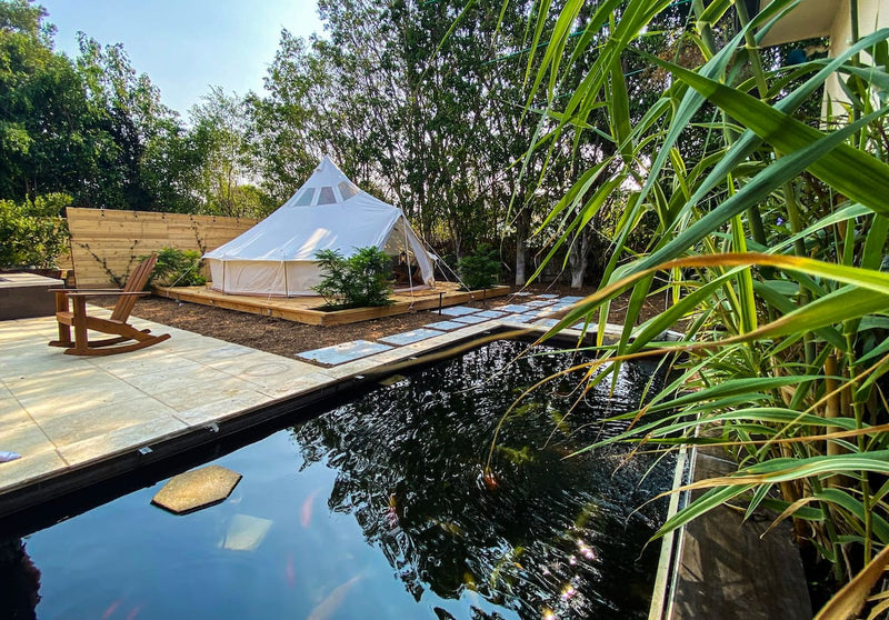 Your private grounds have so many amazing luxurious amenities: a treehouse spa, jacuzzi, ice bath, fire pit, private bath and even a koi pond - glamping at its finest!