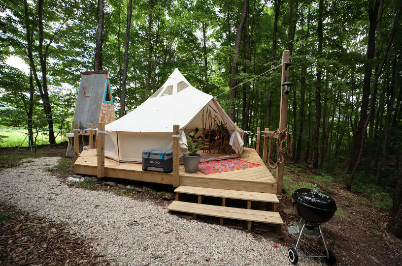 The Forest Belle campsite at Bellfire sits on a large deck with many ameneties at your fingerips. Located in the Catskills Mountains surrounded a lush green meadow and forest create a perfect hideaway.