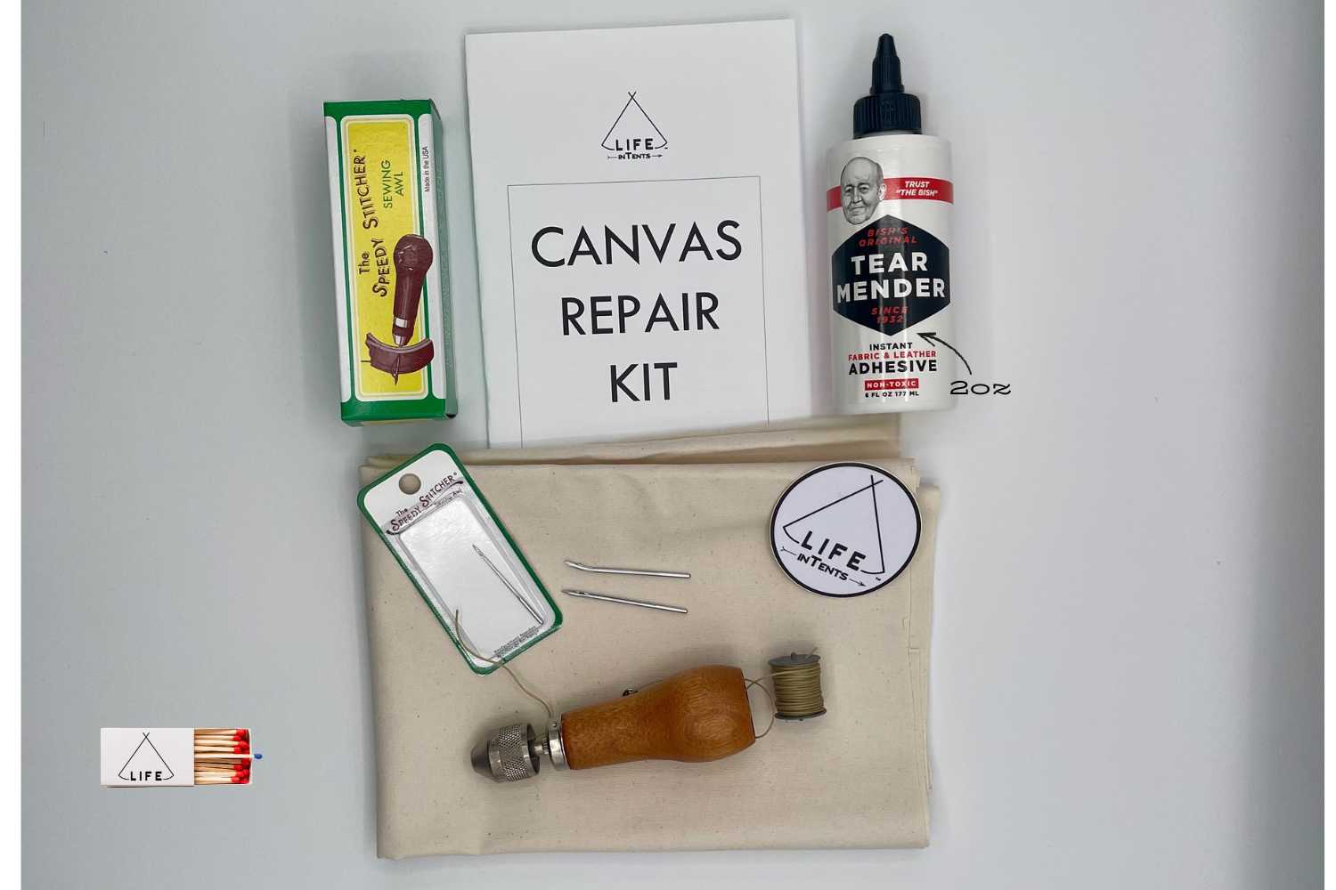This canvas patch kit empowers you to repair tears and holes of your canvas tent.  Includes canvas patches, 2oz Tear Mender canvas glue, canvas sewing tool (optional) and instructions.